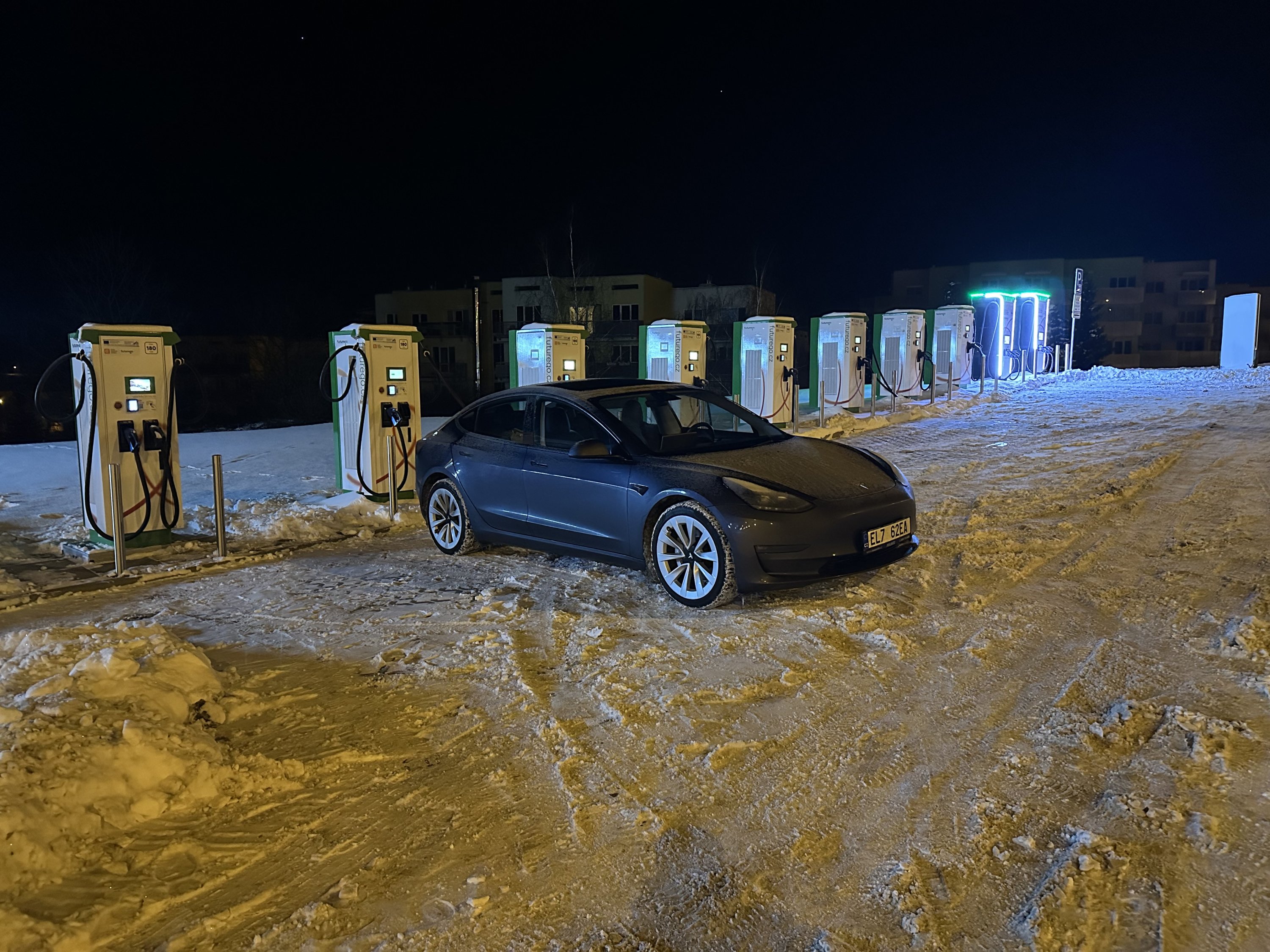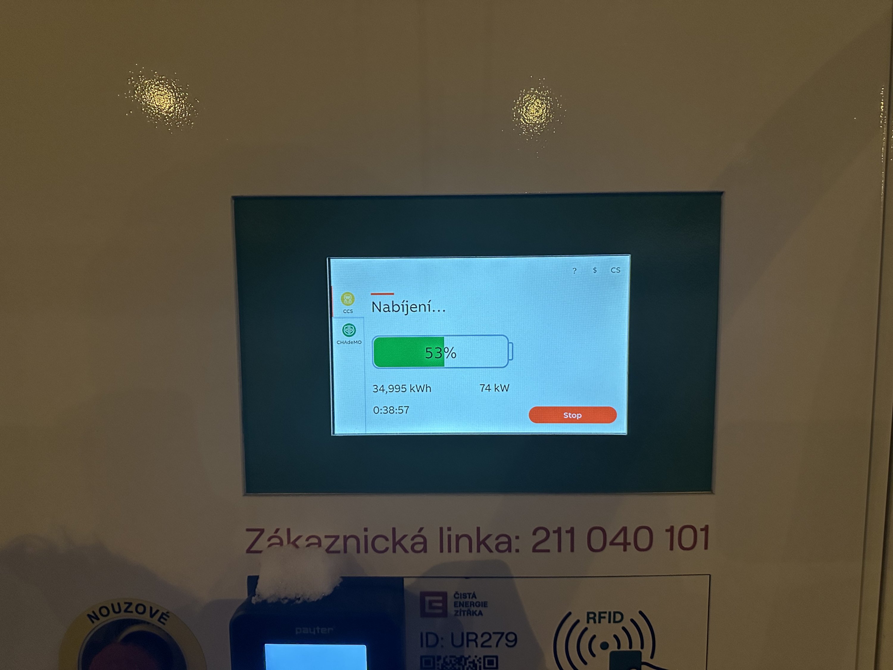 Vyzkoušeli jsme si i extrémní test dobíjení v zimě. Venku bylo cca -12 stupňů, baterka ukazovala 15 %, vydali jsme se proto k dobíjecí stanici ČEZ, která měla výkon dobíjení až 180 kW. Po zapojení kabelu u auta s nepředehřátou baterií musíte počítat s tím, že nějakou dobu se auto nabíjet vůbec nebude, ale nabíječka bude sloužit k tomu, aby předehřála a připravila baterii na nabíjení. V našem případě to bylo cca 20 minut (za které samozřejmě platíte). Námi testovaná Tesla měla maximální výkon DC nabíjení 250 kW, v té zimě a se studenou baterkou jsme se dostali na maximální hodnotu kolem 95 kW.