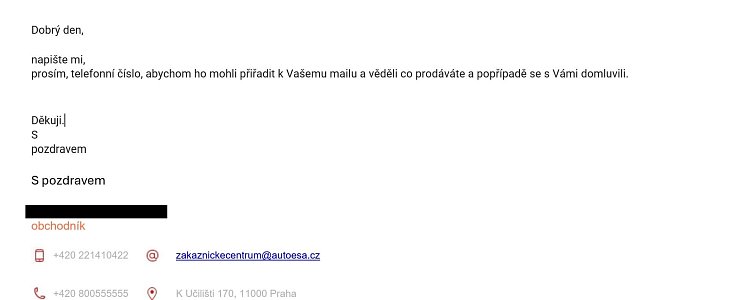 Následoval další email, ve kterém mě pracovník Auto ESA vyzýval, abych zaslal své telefonní číslo, aby jej mohli přiřadit k emailu, aby „věděli, co prodávám“ a případně aby se se mnou domluvili. V dalších dvou emailech se tento požadavek v různých obměnách opakoval. Ani v jednom případě však nezazněl, byť jen orientační, cenový odhad výkupu vozu. Celkem tedy přišly čtyři emaily, jejichž společným jmenovatelem byl opakovaný požadavek na získání telefonního čísla, nikoli snaha nabídnout konkrétní cenu na základě dodaných dat. Opravdu bez telefonu nelze orientačně nacenit auto?